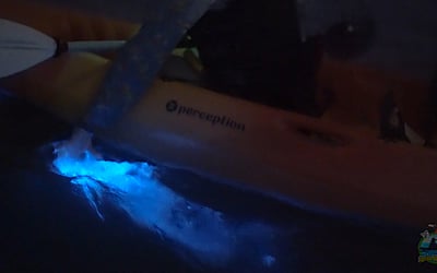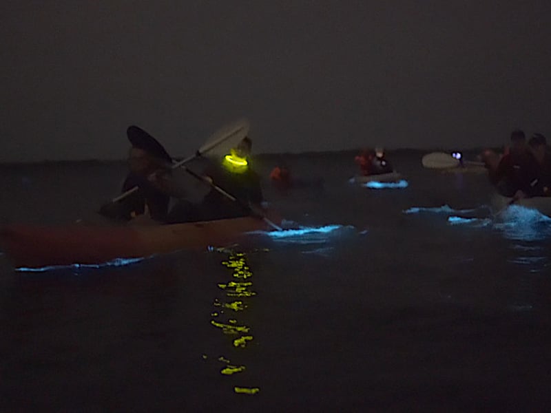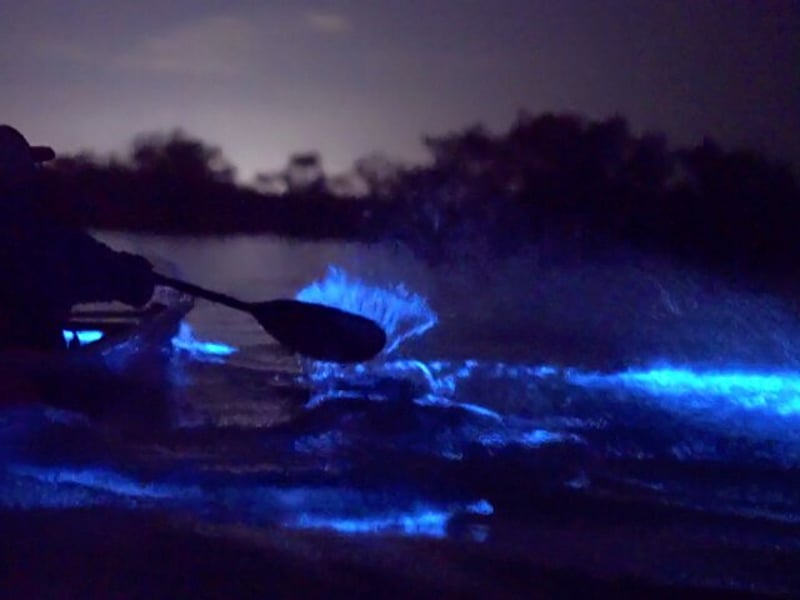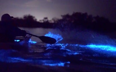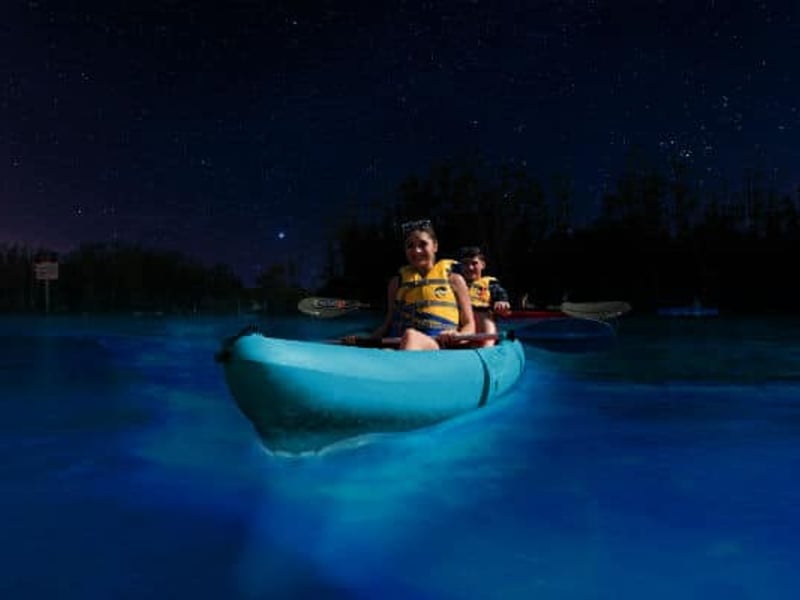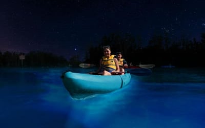 Paddle clear kayaks through glowing waters at night and witness nature's captivating light show.