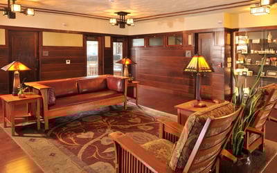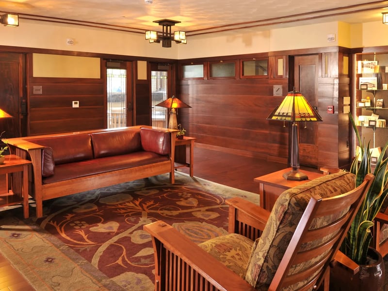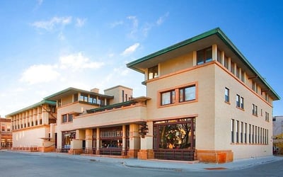 Explore the last remaining Frank Lloyd Wright-designed hotel and its adjoining bank on a guided tour. Hear how citizens saved and restored these Prairie School landmarks and discover their architectural details.