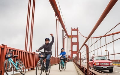Ride the waterfront and cross the Golden Gate Bridge to Sausalito, with a ferry return option