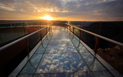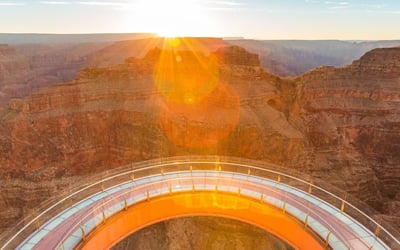 Travel from Las Vegas to Grand Canyon West on a comfortable bus. Enjoy a Hoover Dam photo stop, hot breakfast, BBQ lunch, and included entry, with options to add the Skywalk or a helicopter flight.