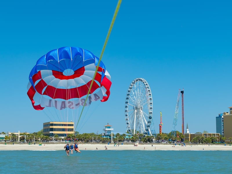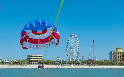 Ride a banana boat shuttle offshore and soar above the Grand Strand. Enjoy a 10–12 minute parasail flight within a 30–45 minute excursion.