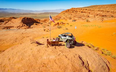 Experience a thrilling ATV adventure across red rocks and sand dunes with included meal and gear.