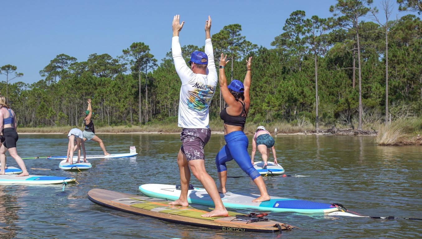Join us on the water for a beginner-friendly stand up paddle board yoga class on the calm waters of Little Lagoon in Gulf Shores. Certified instructors guide you through a peaceful floating practice with time to paddle and play.