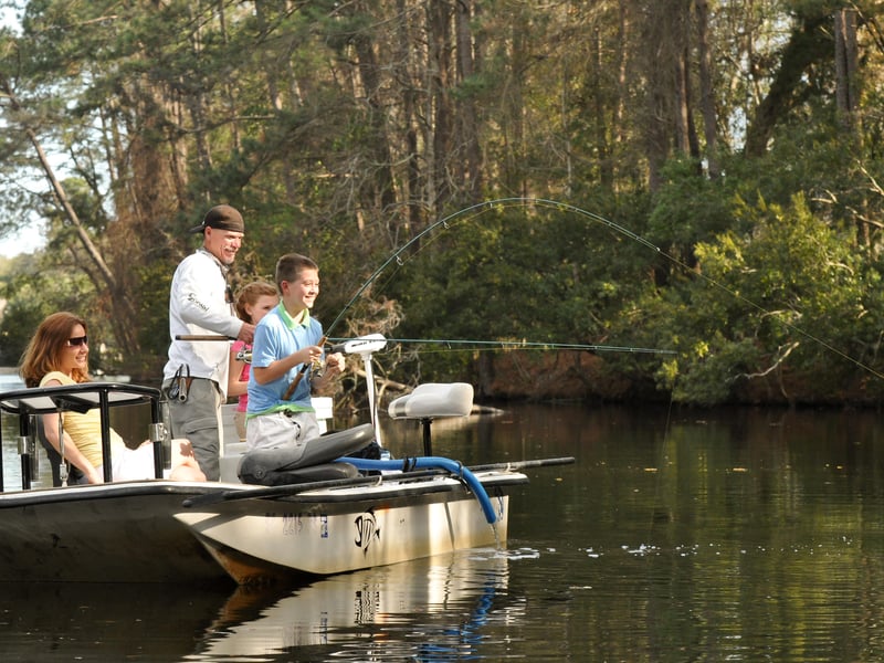 Fish calm Palmetto Dunes lagoons with a native guide aboard a quiet electric skiff