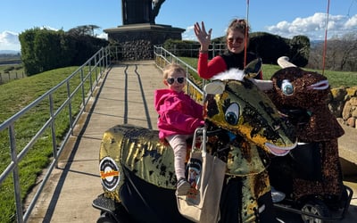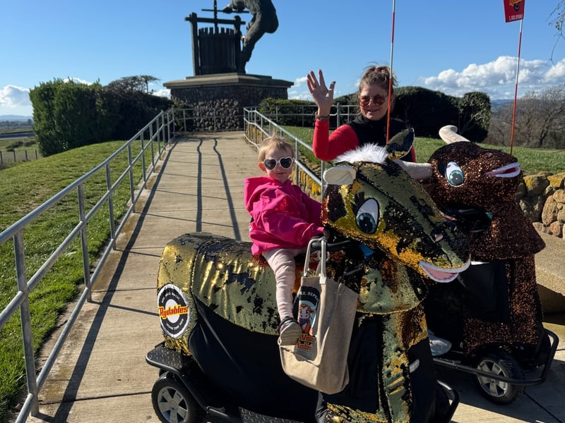 Minors 12 and under must ride with an adult; ages 13+ may drive at operator discretion if they can reach the controls. Wear layers; backpacks are allowed but purses and dangling items are discouraged. No drinks, coffee, or food on Rydables. Each one can hold up to 400 lbs, total. One adult per RYDABLES cart; unless riding with a 12-year-old or younger child. Must be 13 years old or older in order to ride/drive alone. We reserve the right to have a 13 year old ride with an adult after a test ride.
