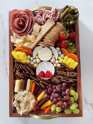 The board features two types of meat, a variety of cheeses, fresh fruit, and crackers, thoughtfully curated to complement each other. Please mention any allergies in the "additional notes" with your order.