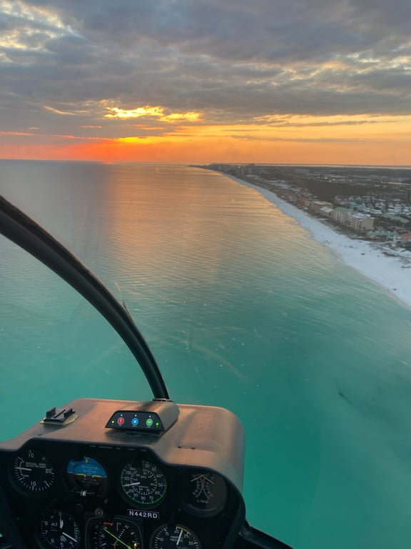 Fly along the Emerald Coast on the Jaws Run route from Destin to the western edge of Topsail State Park. Enjoy coastal views and watch for marine life near the reefs during this scenic helicopter flight.