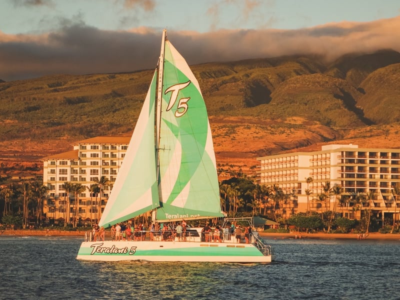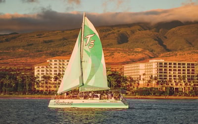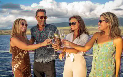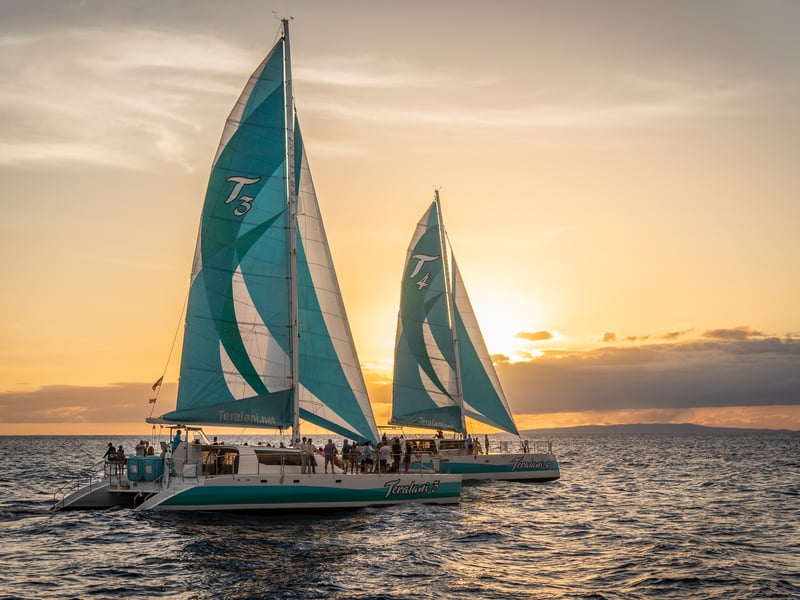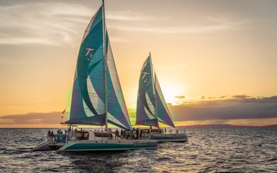 Savor a four-course dinner and open bar on a luxury catamaran as you sail West Maui at sunset