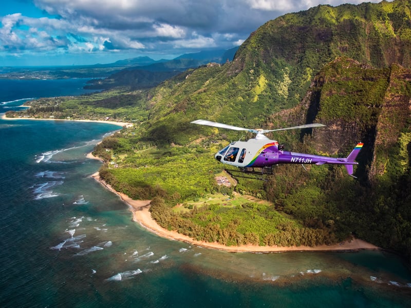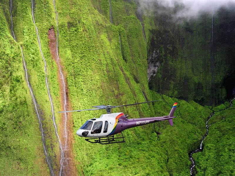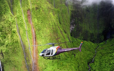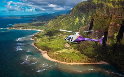 Explore Kauai from the comfort of a six-passenger AStar with an air-conditioned cabin, Bose noise-cancelling headsets, and a plush interior. Enjoy floor-to-ceiling windows on a 60-65 minute flight showcasing waterfalls, canyons, sea cliffs, and beaches.