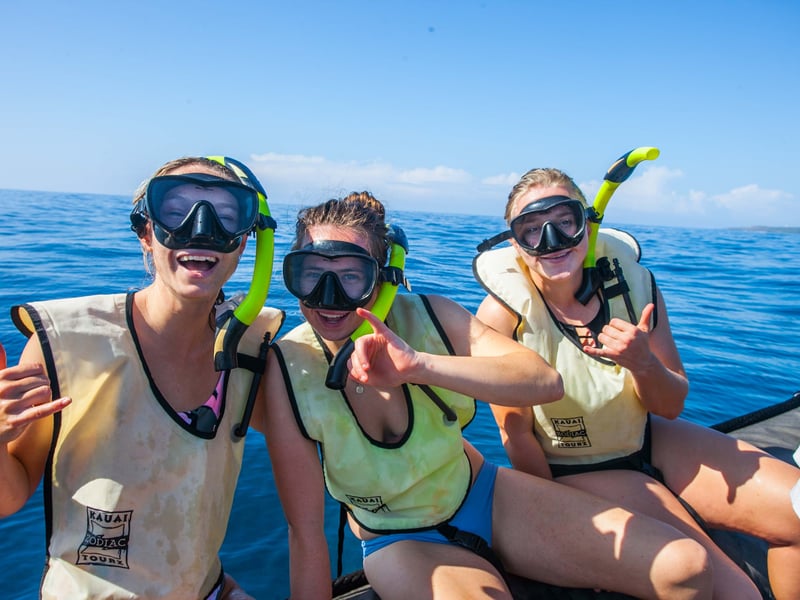 Ride a fast Zodiac from Poipu to remote south shore reefs and caverns. Snorkel vibrant coral and watch for turtles and dolphins with a skilled local crew.
