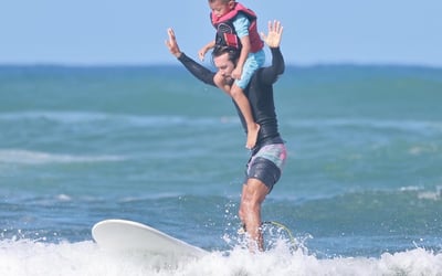 Help your child gain confidence in the ocean with a tandem surf lesson. An instructor shares the board to guide each step during this 1.5-hour session, with all gear provided.