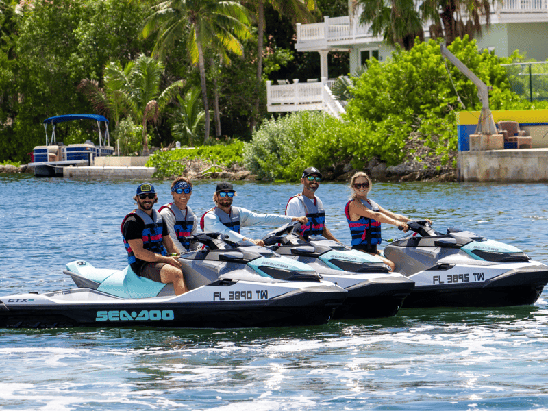 Arrive 30–60 minutes early for check-in and a safety briefing. Guests 18+ need a physical government-issued photo ID; if born in 1988 or after, a Florida Boater Safety License is required to operate. Minimum age is 4; up to 3 riders per jet ski with a 460 lb combined limit; minors must check in with a natural parent and drivers must understand English.