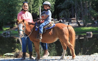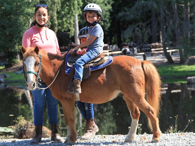 Ages 3–7 only; no riders under 3. Children under 8 must have a parent or adult lead their pony. One rider per pony. Wear jeans and boots with a heel; certified riding helmets are required, with loaners available.