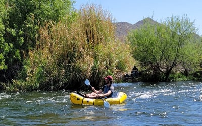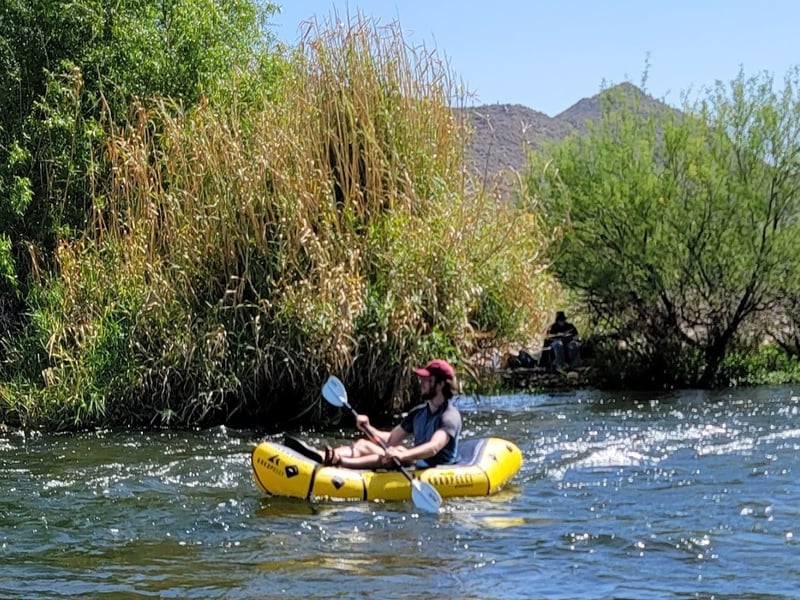 Rent a lightweight Kokopelli packraft with paddle, pump, and PFD for lakes or rivers