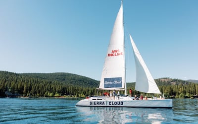 Sail Lake Tahoe aboard the 55′ Sierra Cloud catamaran on a two-hour cruise. Glide along untouched shores and enjoy panoramic views from the nets or cushioned seating.