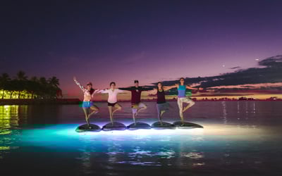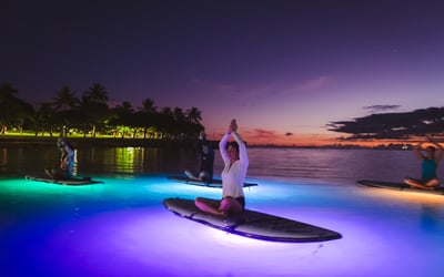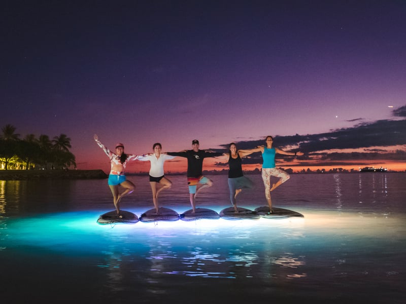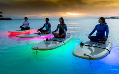 Move intentionally across calm, dark ocean water lit by vibrant underwater LEDs. Enjoy a tranquil 75-minute paddle as city lights shimmer around you.