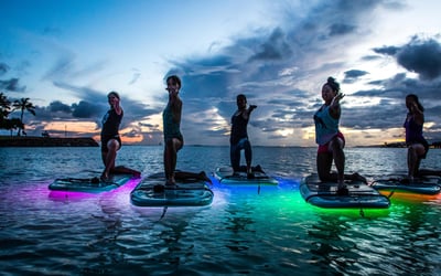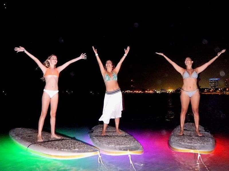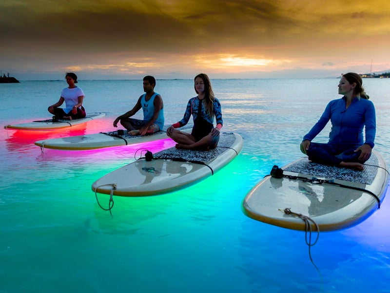 Glide across calm ocean waters under glowing LED lights for a tranquil nighttime paddle.
