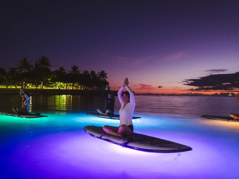 Paddleboard yoga on the ocean sounds intimidating, but most first-timers here found it surprisingly doable and genuinely magical. The instructors really seem to make the experience – names like Kelsey, Allie, Sariah, and Lety come up repeatedly for being attentive, encouraging, and skilled at working with everyone from total beginners to experienced yogis. They'll guide you through getting comfortable on the board before moving into poses, and they're great about modifications and meeting people where they are. Expect dreamy moments like doing downward dog while gazing at the water's surface, dipping your hands and feet in to cool off, and maybe even spotting a sea turtle swimming beneath you. The setting at Magic Island offers gorgeous mountain and ocean views, and if you time it right, you might catch Friday night fireworks or a stunning sunrise. There's one notable complaint worth mentioning: a visitor had a frustrating experience with a Friday evening instructor in August 2025 who seemed unprepared (not enough anchors for all the boards), had a negative attitude from the start, and mishandled the photo add-on situation in a way that felt dismissive and unprofessional. That stood out as an outlier in an otherwise overwhelmingly positive collection of feedback. Speaking of photos, the $10 add-on gets mentioned as totally worth it. Most people describe this as a highlight of their Hawaii trip – challenging enough to feel like an accomplishment but relaxing enough to melt away travel stress. It's particularly popular with honeymooners and those looking for something uniquely Hawaiian beyond the usual beach day.