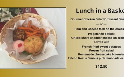 Enjoy lunch in the Victorian Tea Room at Falcon Rest’s Visitor Center. Share a charming meal with friends or family, with lunch offered with or without a tour.
