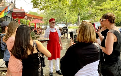 Walk about 1.25 miles on mostly level surfaces; some stops may involve steps or stairs. Children five and under are free but do not receive food; ages six and up require a ticket. Vegetarian and some gluten-free options are available but cross-contamination cannot be guaranteed; tours run rain or shine.