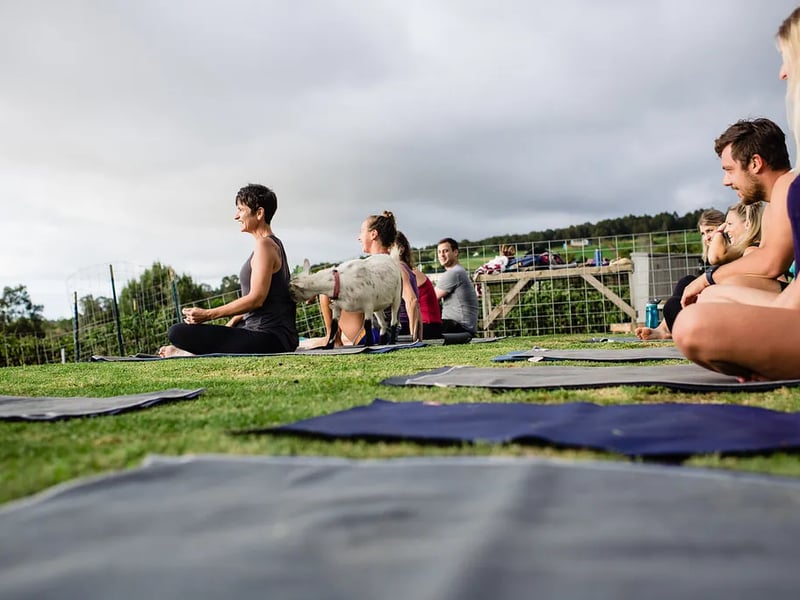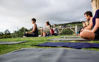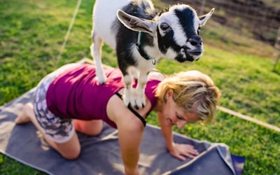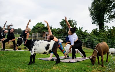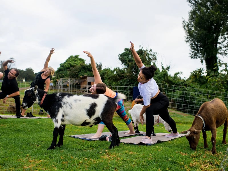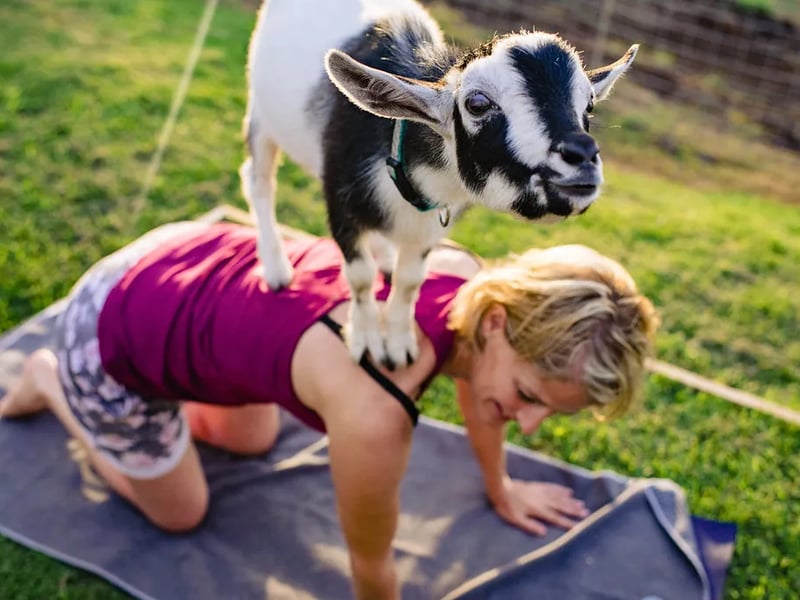 Flow through an uplifting outdoor class as friendly miniature goats interact and play around you