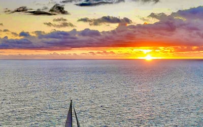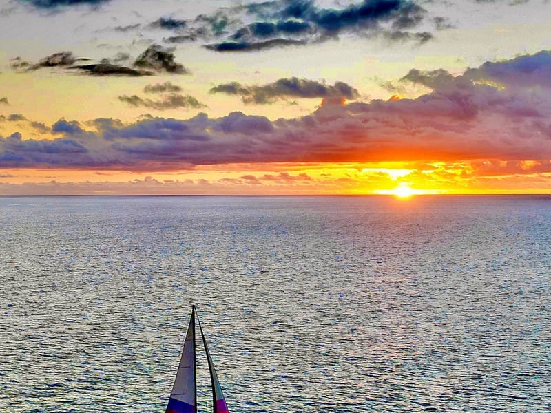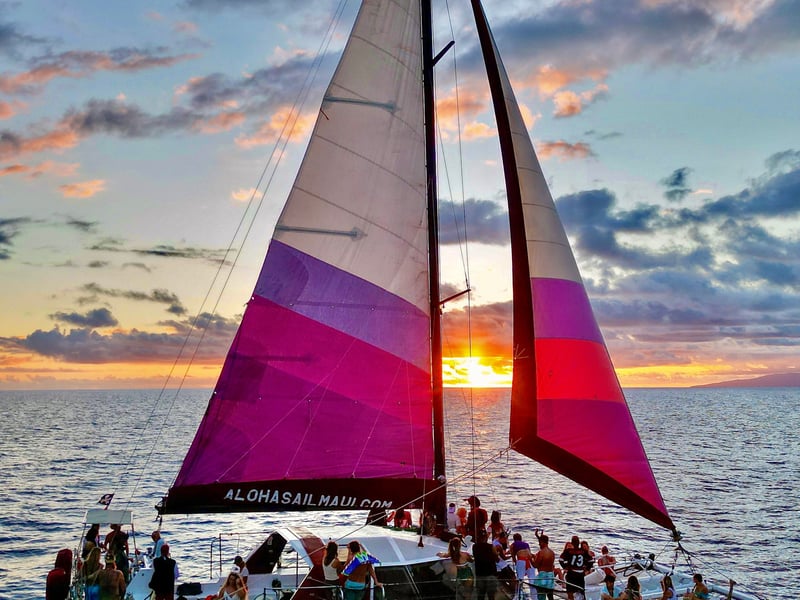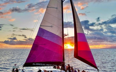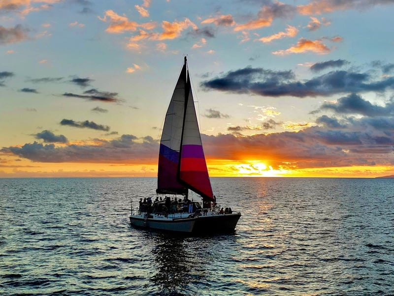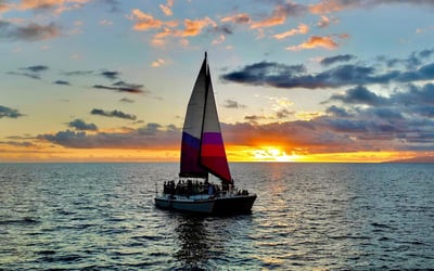 Sip island cocktails and savor appetizers as you sail at sunset aboard a Hawaiian-built catamaran
