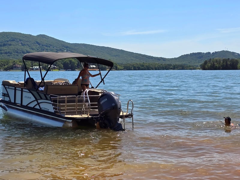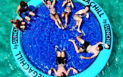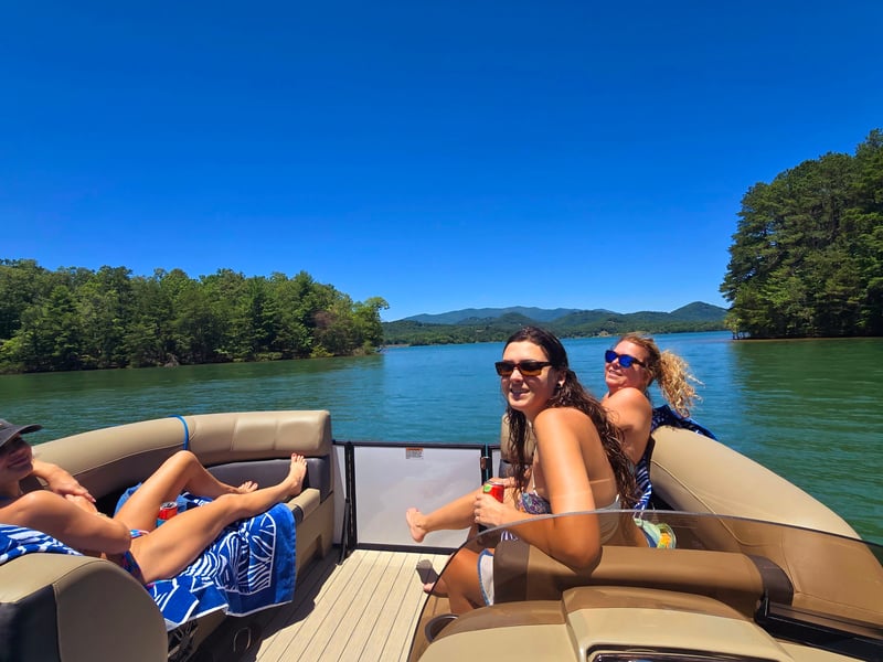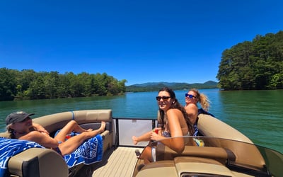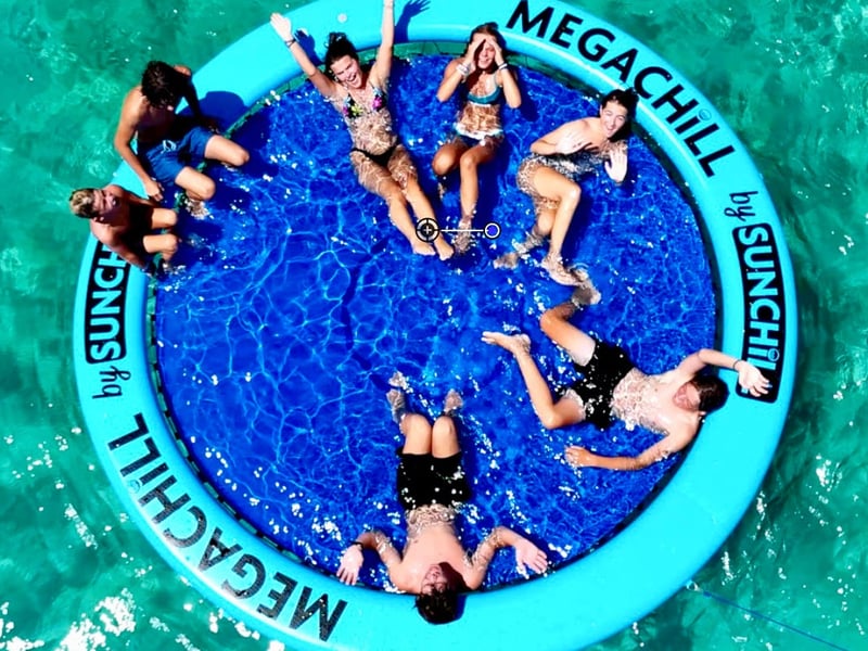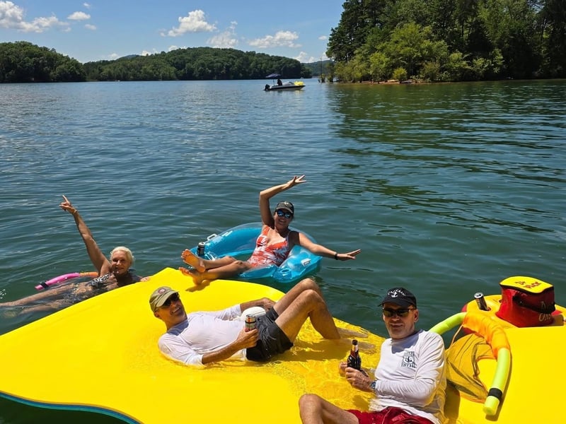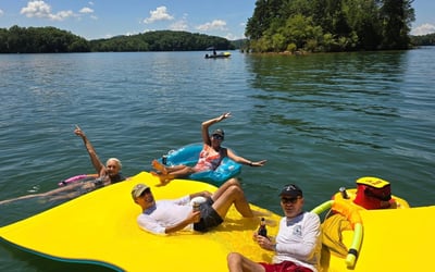 Swim in the clear waters of MegaChill Cove on Lake Chatuge. Enjoy a giant MegaChill float for your group with included water toys, grill, ice, water, and a Bluetooth sound system.