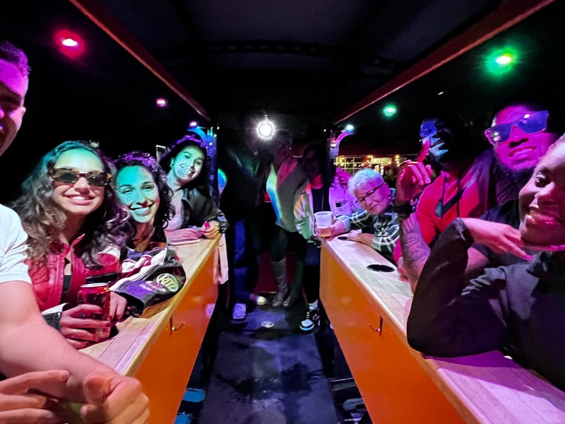 You must be 21+ with valid ID and able to climb aboard without assistance. The bike does not operate in inclement weather. Drinks are not sold on the bike; purchase at stops, and complete the waiver before arrival.