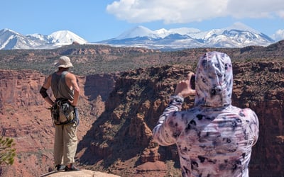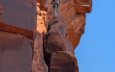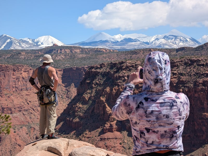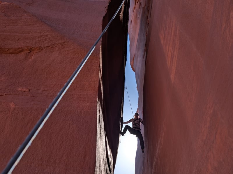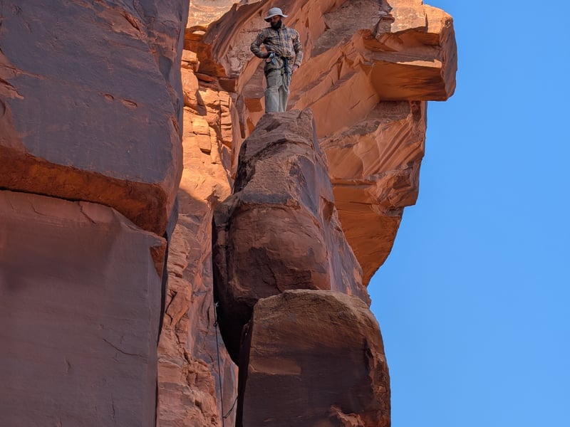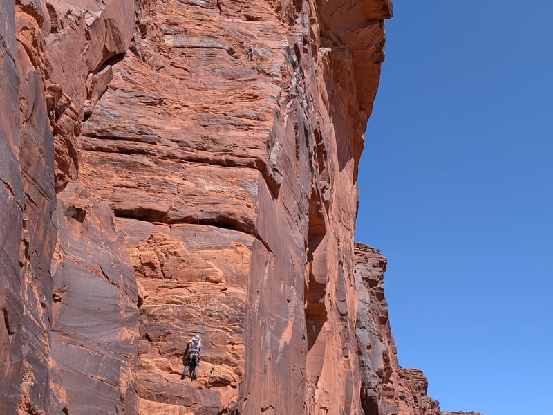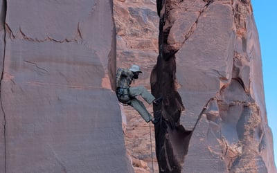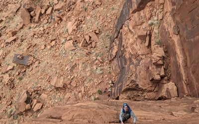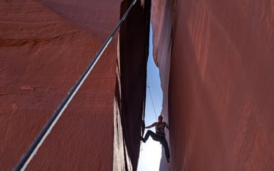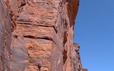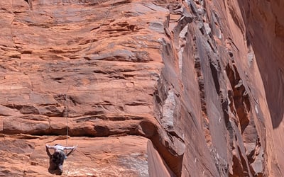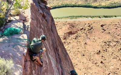 Tackle a private multi-pitch climb on Terma in Moab. Reach the mesa after three pitches with views over the Colorado River and the La Sal Mountains.