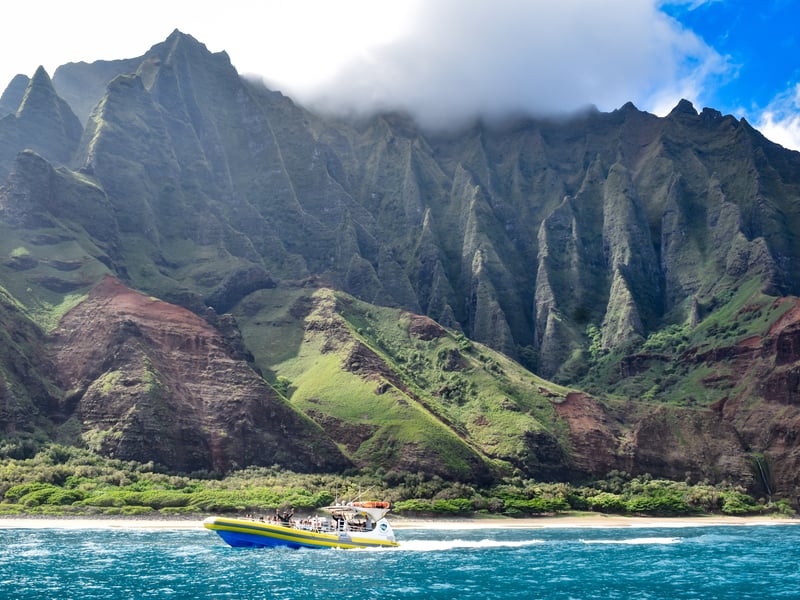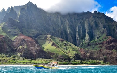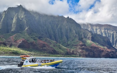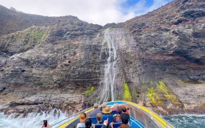 Explore sea caves, waterfalls, and vibrant marine life on a fast-paced 4.5-hour Na Pali Coast raft tour.
