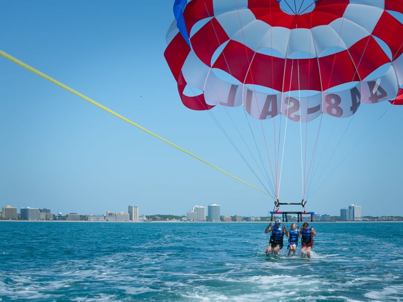 Experience a parasailing adventure in Myrtle Beach with a banana boat ride to the parasail boat and a 10-minute flight. Trips run about 30–45 minutes and are weather dependent; start times may vary.