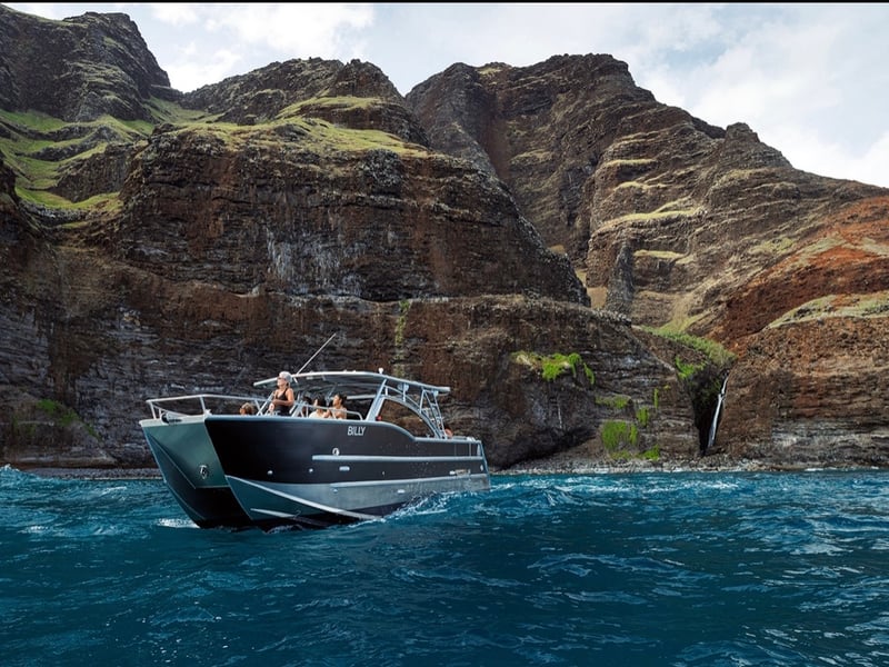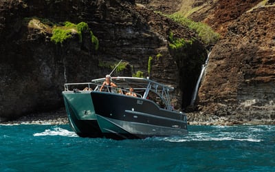 Cruise Kauai's famed Na Pali Coast aboard a 34-foot power catamaran. Swim among colorful fish at Nu'alolo Kai and hear legends shared by the native Hawaiian crew.