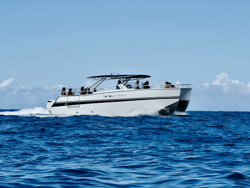 Glide along the Na Pali Coast on a fast catamaran with calmer morning seas and chances to spot dolphins