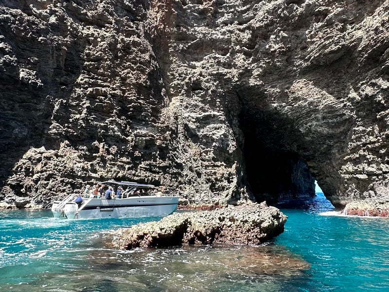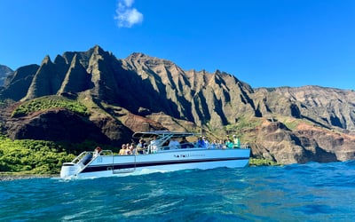 Glide along Na Pali on a fast power cat with smoother morning seas and chances to see dolphins