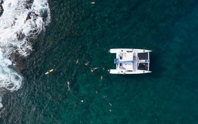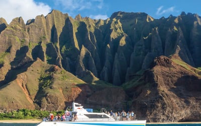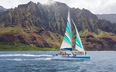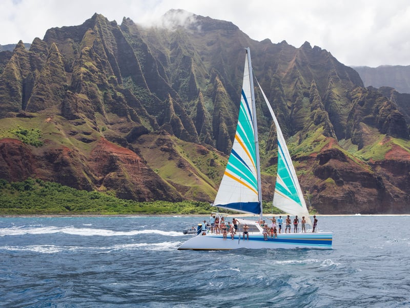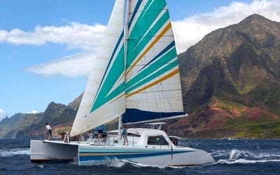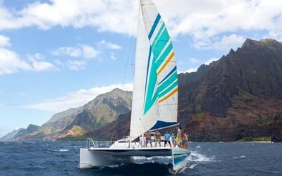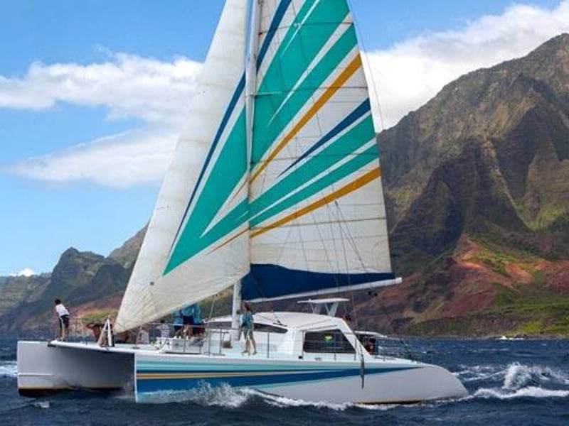 Sail a 50' catamaran along Kauai's cliffs and dive in for guided snorkeling with gear and lunch provided