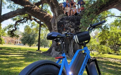 Explore New Orleans on Class 2 e-bikes with included helmet, lock, and handlebar bag
