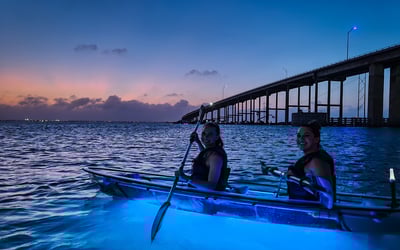 Paddle LED-lit clear kayaks on calm Laguna Madre waters to glimpse glowing marine life after dark