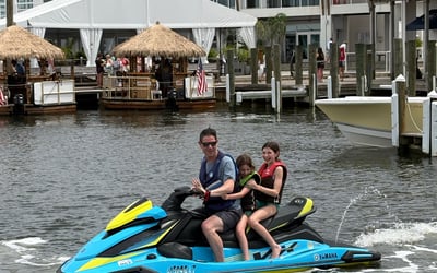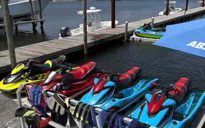 Drivers must be 16+; if under 18, an adult 18+ must sign. Jet skis are three seaters with a recommended 400 lb max; three adults are not permitted. Bring a photo ID for all drivers at check-in.