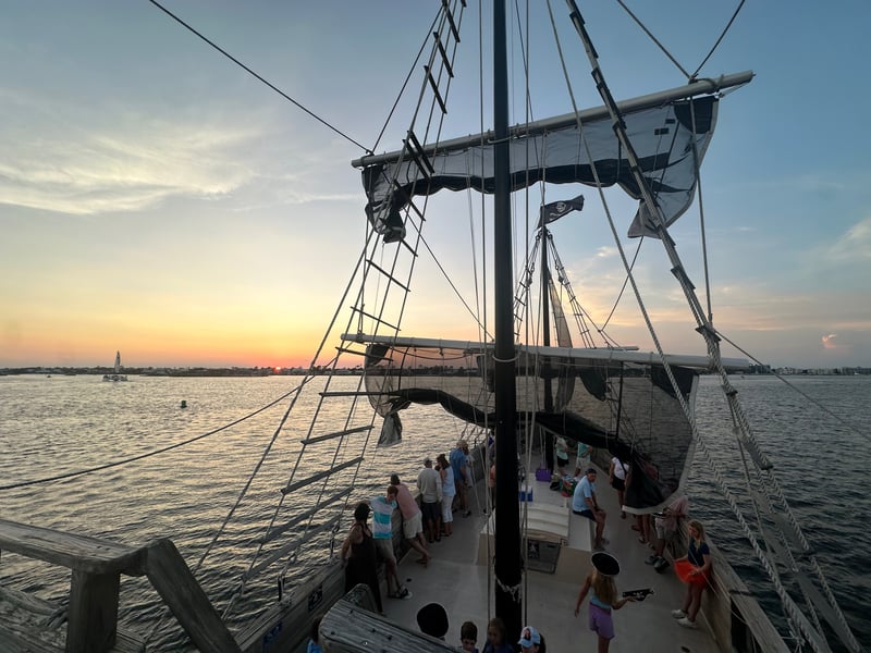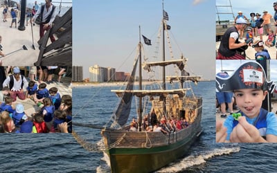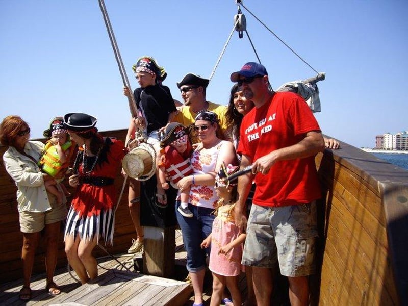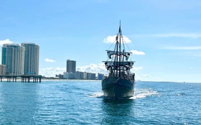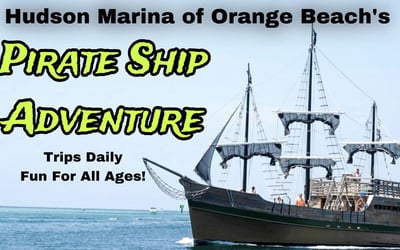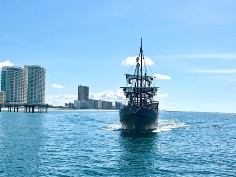 Join a 65ft wooden pirate ship for interactive games, songs, and family fun on Orange Beach