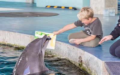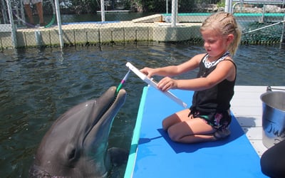Enter the water on a floating platform and sit beside a trainer as a dolphin paints a vibrant canvas. Choose your color palette and help guide the brush while learning about the animal’s intelligence.