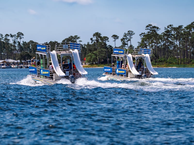 Ride a spacious 14-person pontoon featuring two slides and a free lily pad.