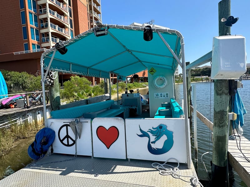 Cruise calm Pensacola waters on a covered pontoon to spot playful dolphins and coastal landmarks.