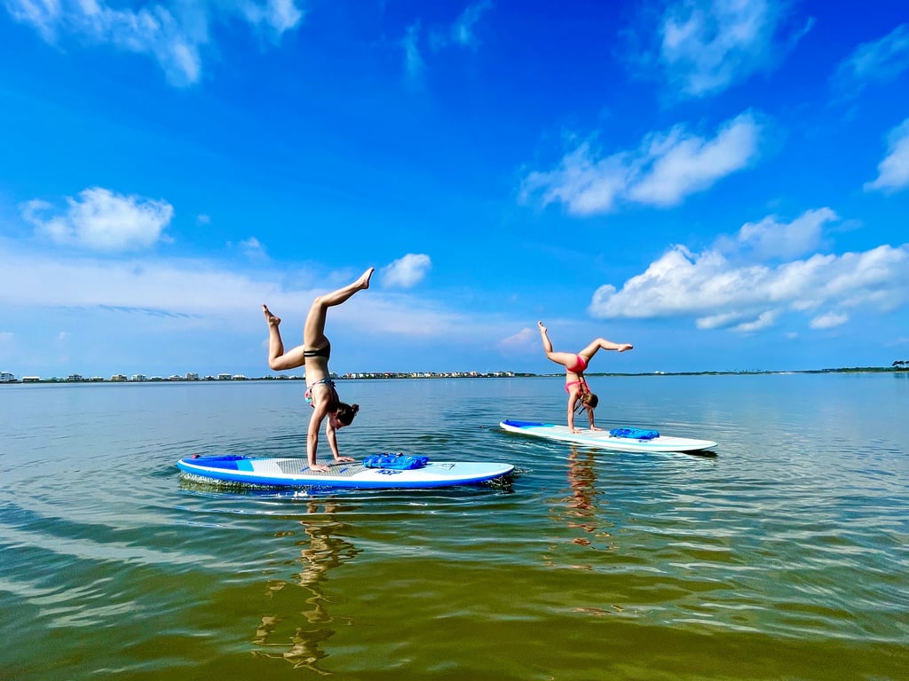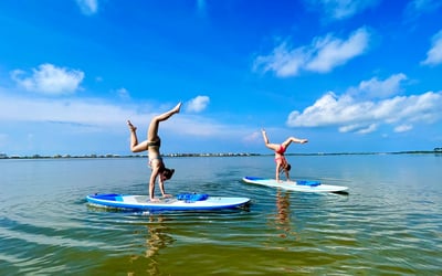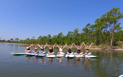 Experience a serene paddle board yoga class on calm Pensacola waters. Glide atop a stable board as certified instructors guide a mindful, all-levels practice.