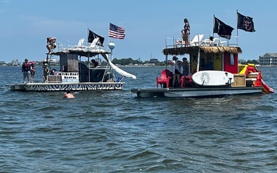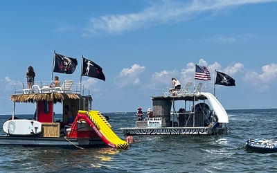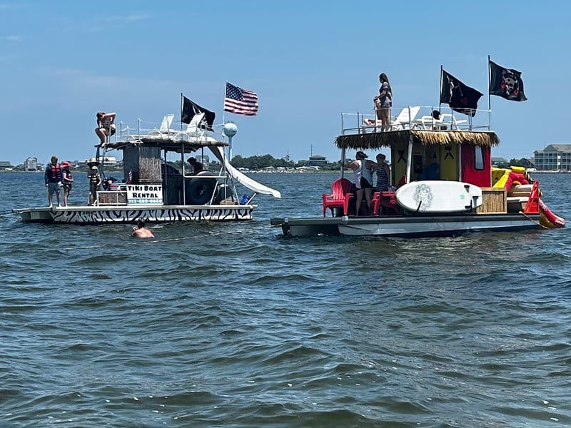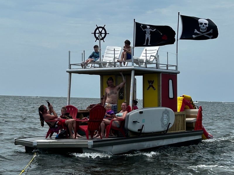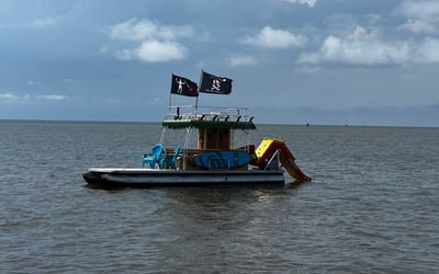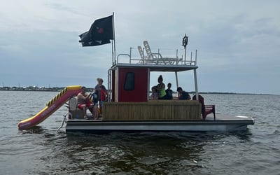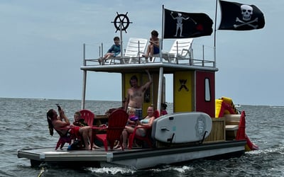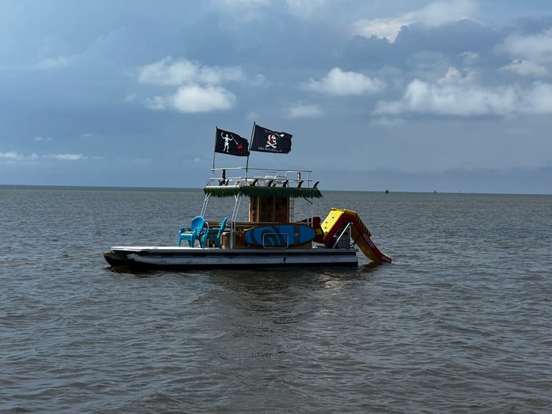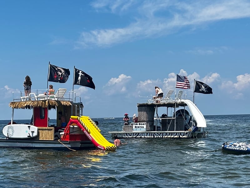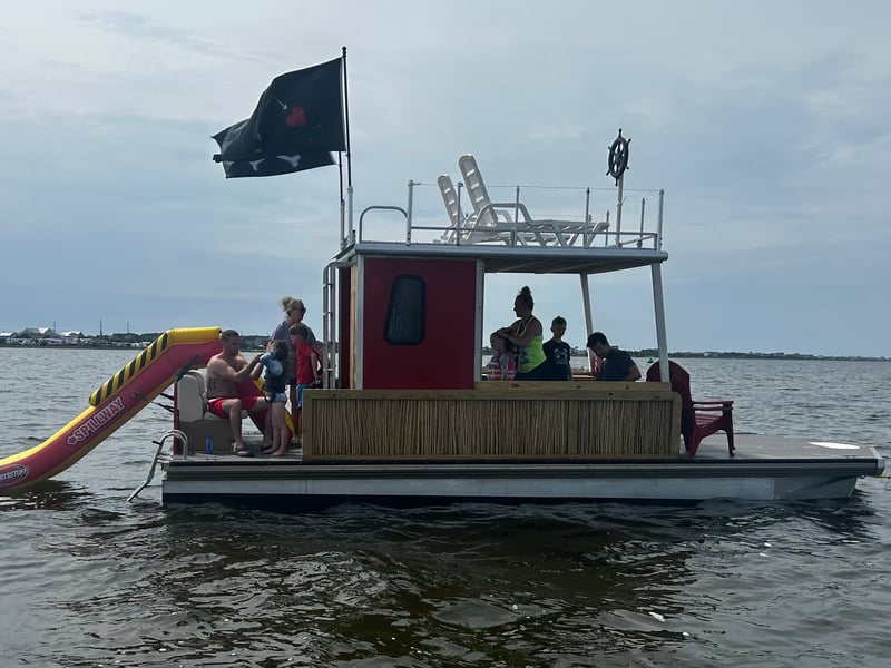 Rent a pirate-themed tiki pontoon boat for a private 3-hour float at a shallow sandbar. Enjoy onboard fun with a 10-foot inflatable slide, picnic table, and water toys while you relax with your own food and drinks.