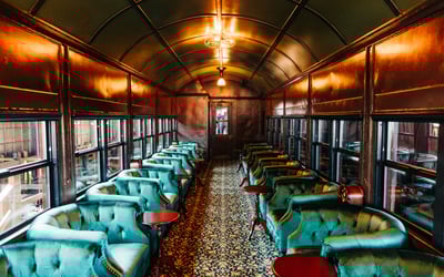 Travel in a redesigned lounge car with cocktails and first-class service on the Pudding Creek Express