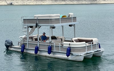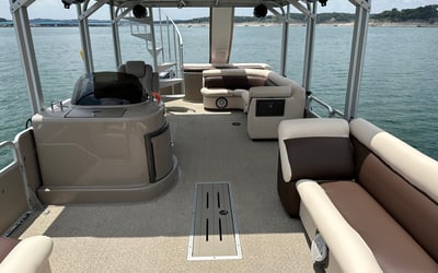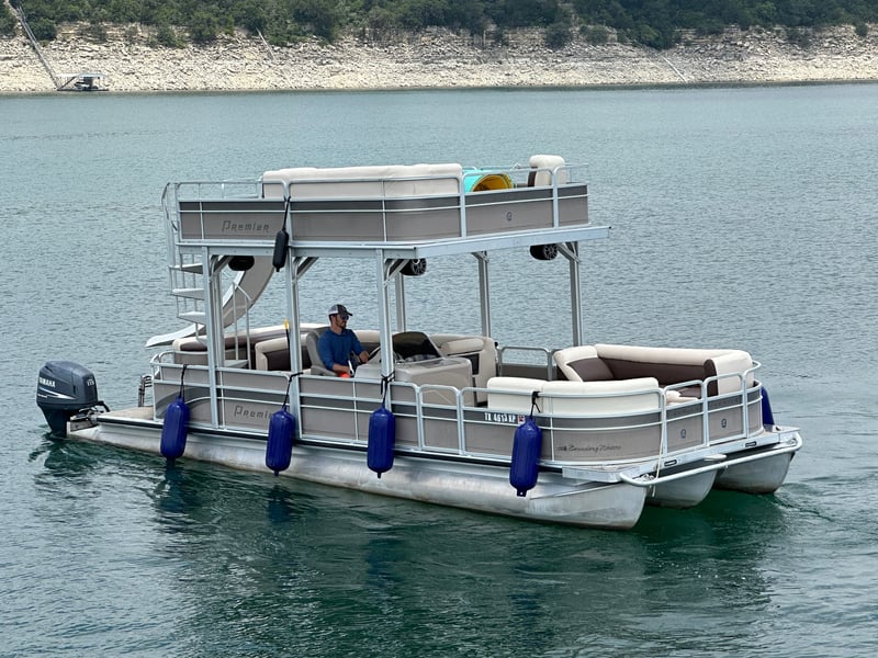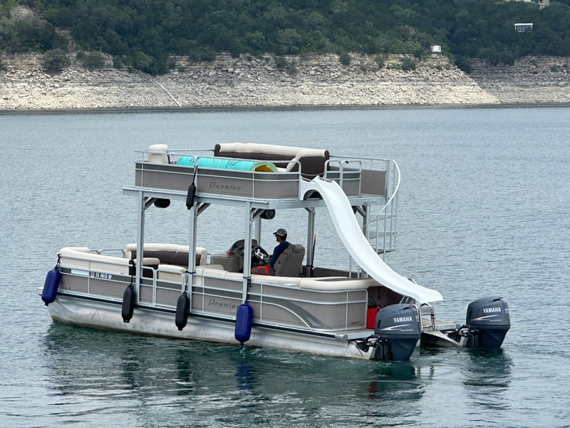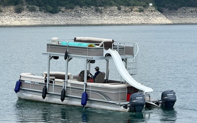 Enjoy a double decker party boat experience on Lake Travis with a captain, slide, and fun amenities. Bring your crew for hours of swimming, music, and relaxation on the water.