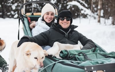 Experience the historic Yukon Quest trail in a cozy enclosed sled with cold-weather gear provided.