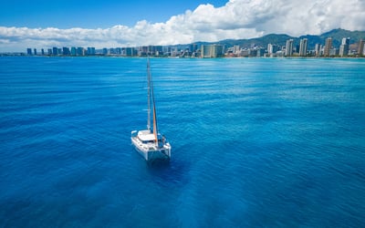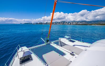 Sail a modern 40' catamaran from Kewalo Basin with spacious lounges and snorkel gear
