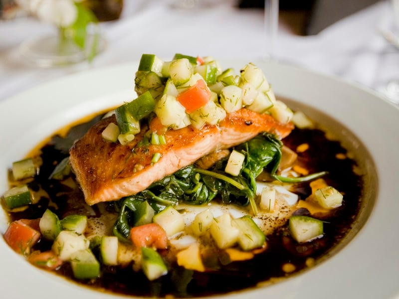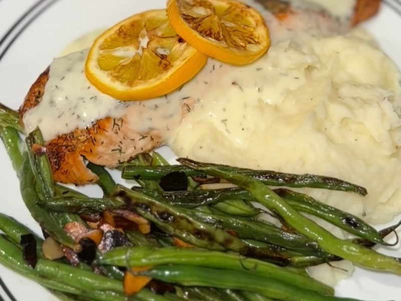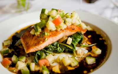 • Grilled salmon with green pea & mint pesto