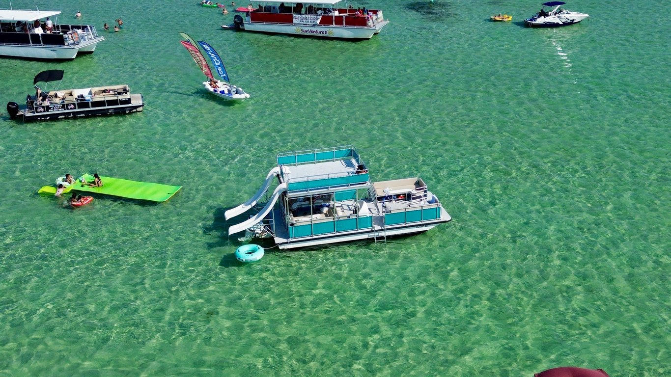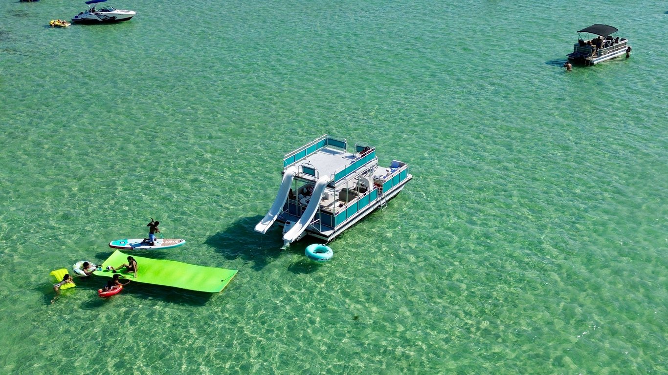 Explore the Destin waters on a private twin-slide pontoon for up to 10. Your captain meets you at the dock and navigates to Crab Island to anchor for swimming and fun.